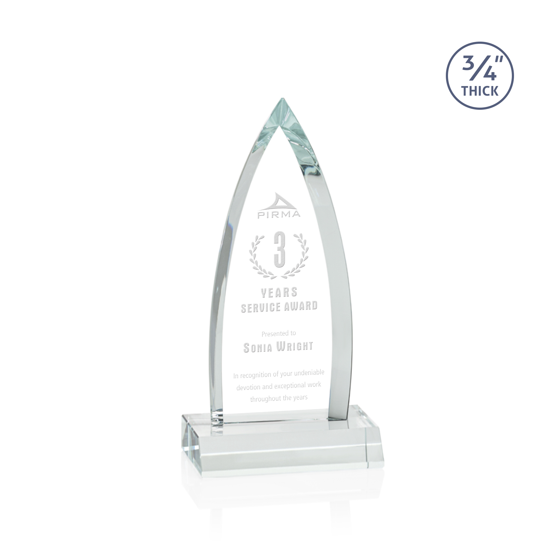 The striking Shildon Award is a 3/4" thick Starfire arrowhead with deep dramatic bevels to recognize a spectacular achievement. Mounted on a clear crystal base. Second position etch optional.