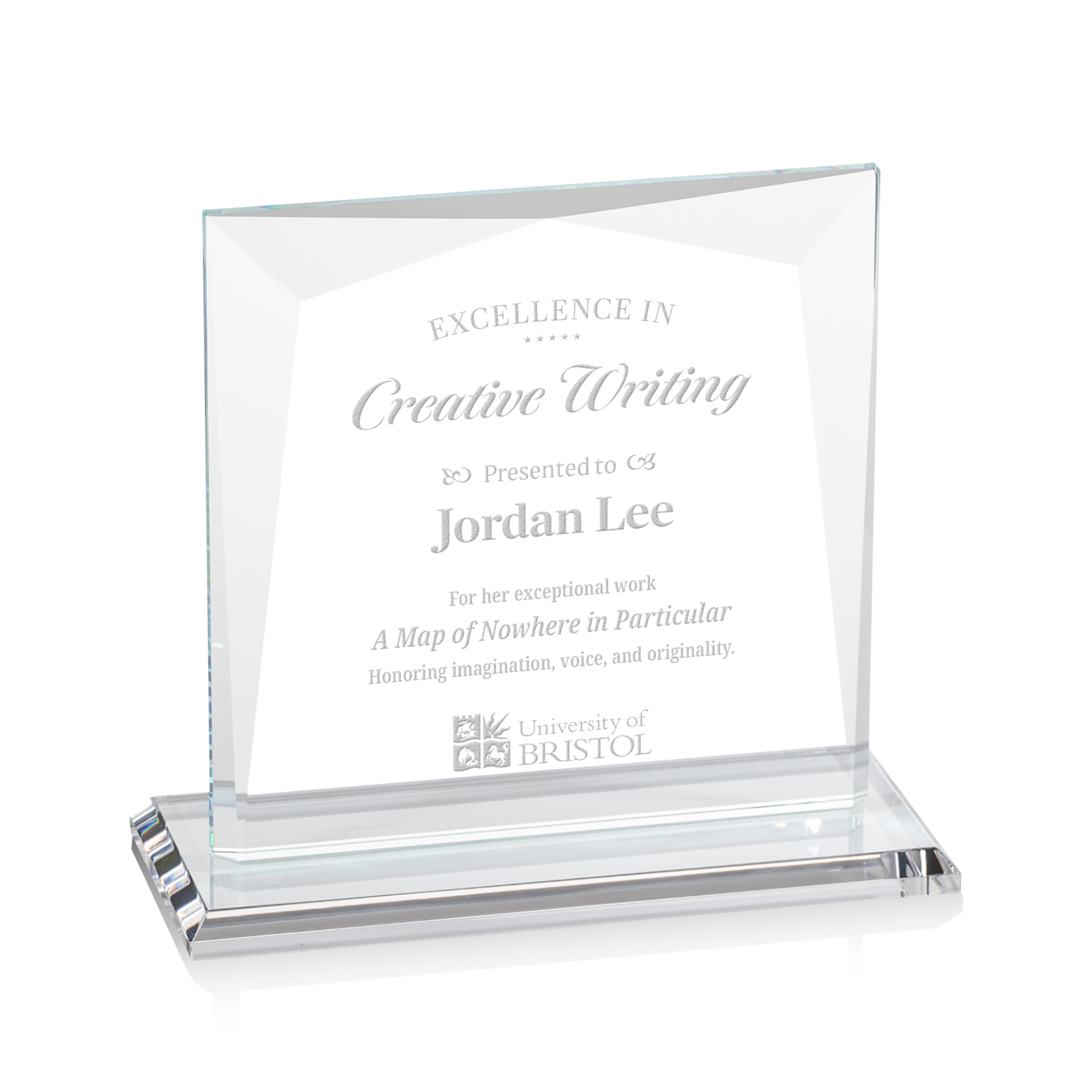 The Starfire Crystal Tanner Award features a stunning Starfire upright framed all around with intricate subtle bevels that beautifully reflect light all around your important accomplishment.