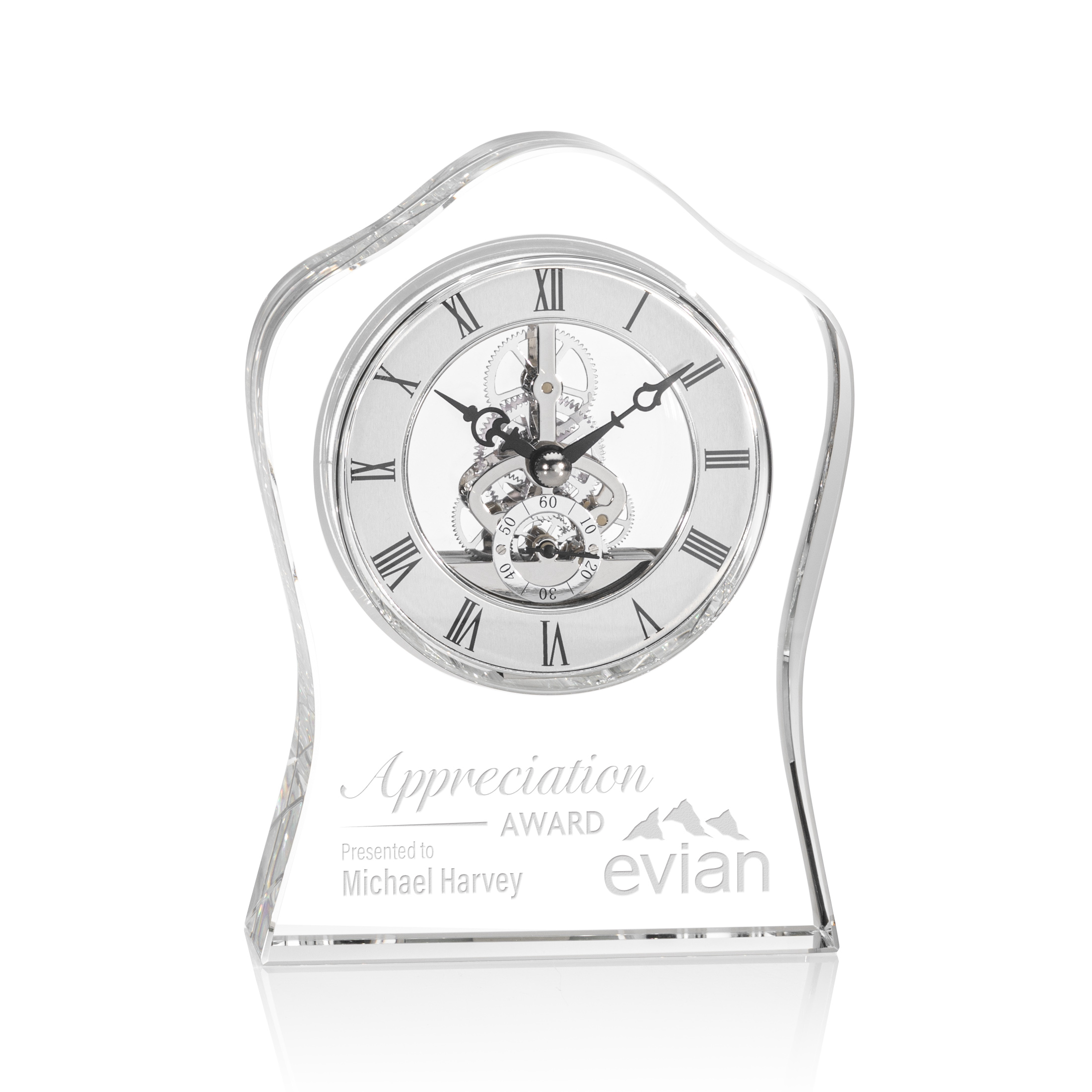 The Regatta Clock showcases a stunning wavy design, crafted from flawless optical crystal for a sleek, modern look. Accented with a silver wheel clock face, this elegant timepiece captures the essence of movement and sophistication.