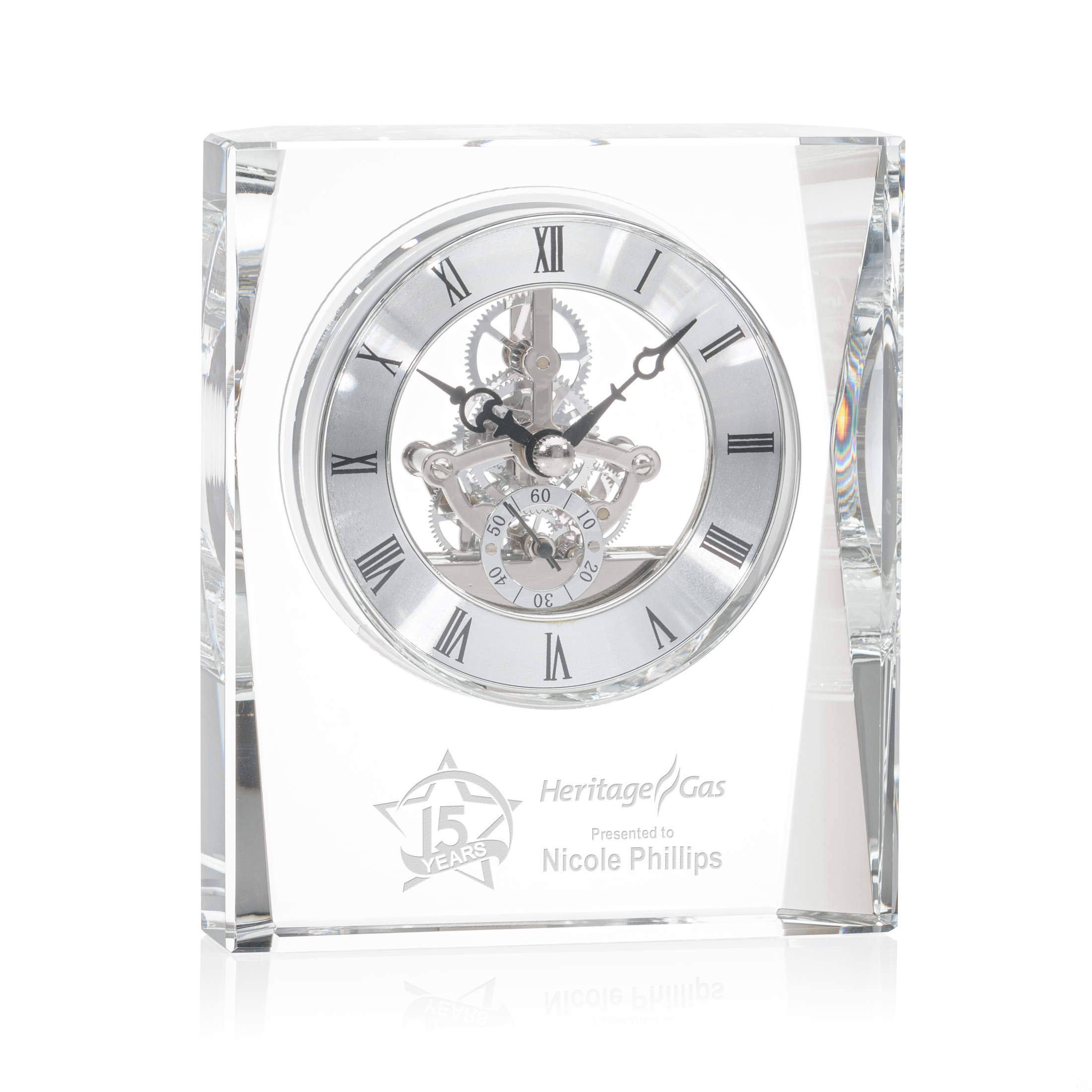 The Rupert Clock is crafted from thick optical crystal with deep, precision-cut beveled edges that catch and reflect light beautifully. Its classic mechanical clock face showcases intricate inner workings, blending traditional elegance with modern clarity. A timeless and impressive piece, the Rupert Clock makes a distinguished gift or statement accent for any desk or shelf.